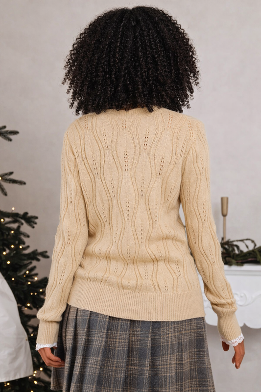 Smoke Gray Pearl Beaded Pointelle Knit V Neck Lace Patchwork Sleeve Sweater