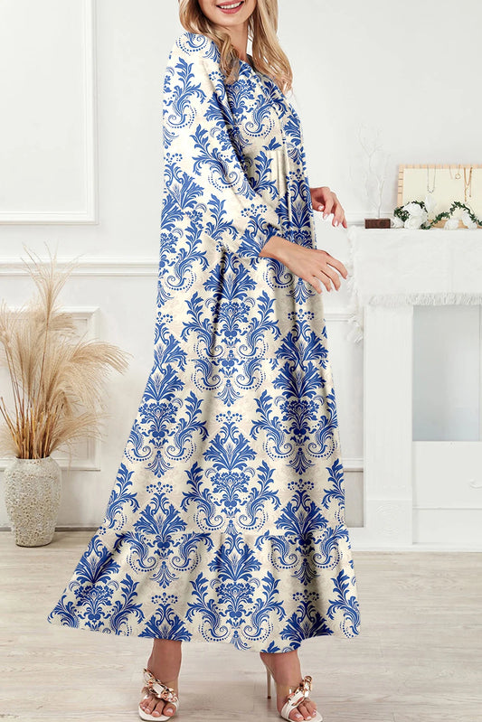 White Floral Print V Neck 3/4 Sleeve Loose Mini Dress