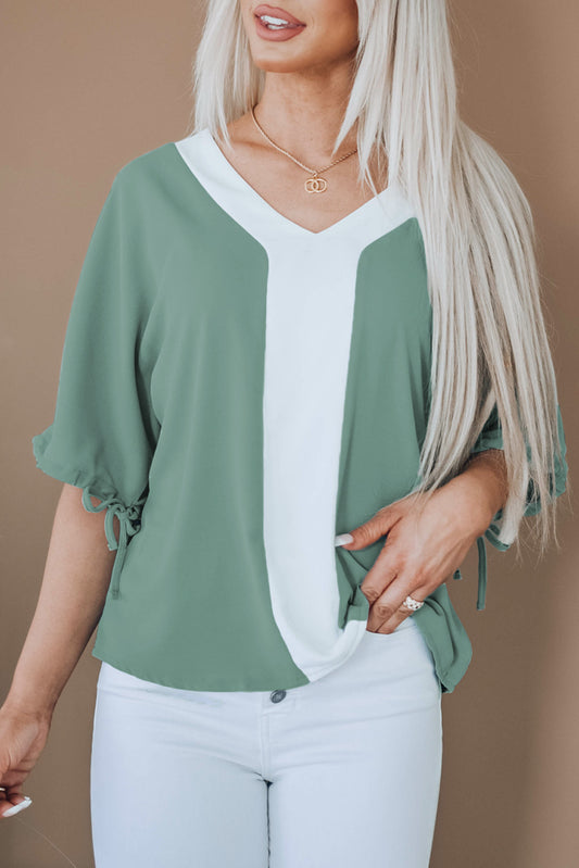 Green Button Split Neck Retro Patchwork Long Sleeve Top