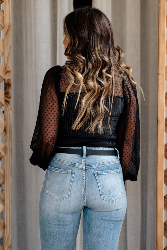 Black Sheer Dotty Long Sleeve Ribbed Velvet Bodysuit