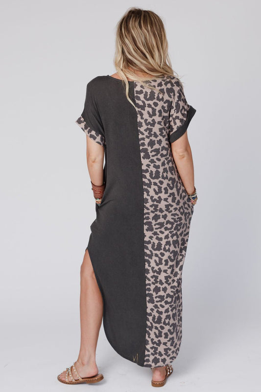 Black Contrast Solid Leopard Short Sleeve T-shirt Dress with Slits