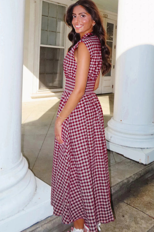 Plaid Print Full Zipper Cinched Waist Fit Flare Sleeveless Maxi Dress