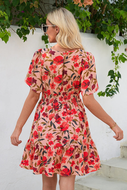 Pink Front Tie Shirred Waist Short Sleeve Ruffled Floral Mini Dress