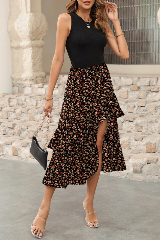 Black Floral Patchwork Asymmetric Ruffle Skirt Solid Tank Bodice Cocktail Dress