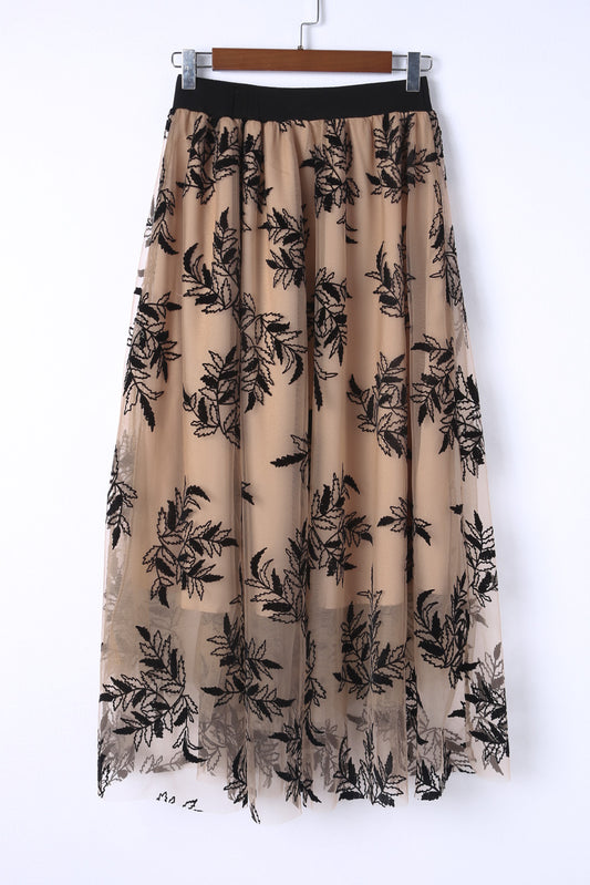 Apricot Floral Leaves Embroidered High Waist Maxi Skirt