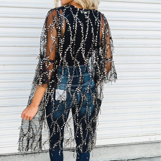 Sequin 3/4 Sleeve Open Front Duster Kimono