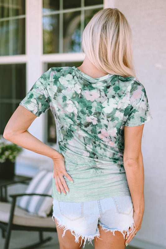 Pink Abstract Floral Print Notch V Neck Rolled Short Sleeve Blouse