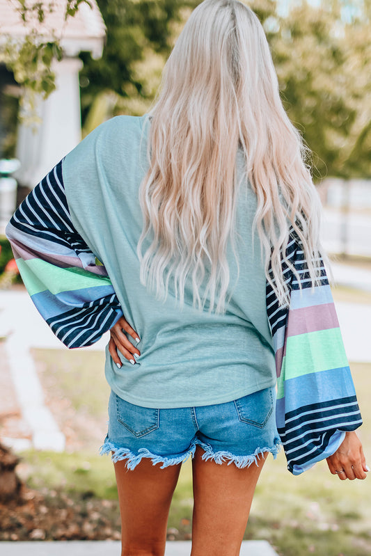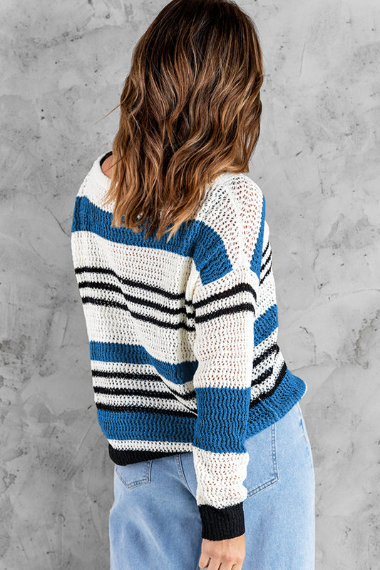Sky Blue Striped Colorblock Long Sleeve Knit Top