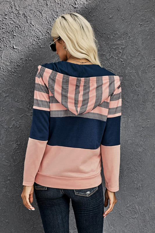 Pink Striped Color Block Drawstring Zip Front Hoodie