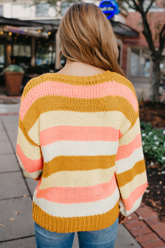 Yellow Striped Puff Sleeve Knitted Pullover Sweater
