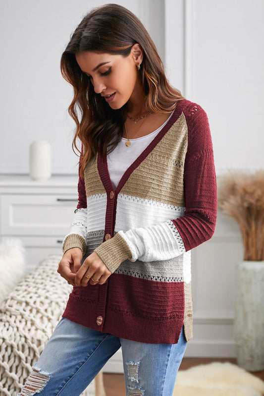 Multicolor V-neck Color Block Button Closure Eyelet Cardigan