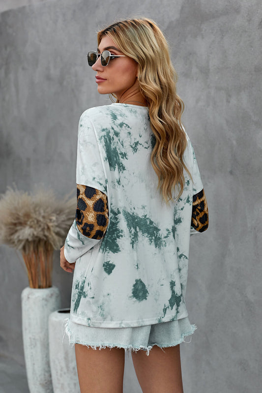 Green Tie Dye Print Leopard Splicing V Neck Long Sleeve Top