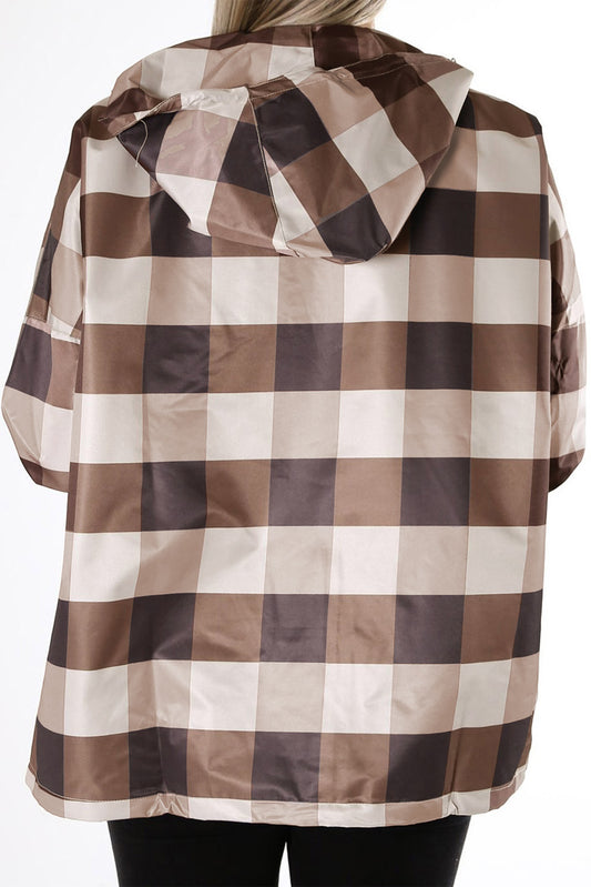 Plaid Print Drawstring Zipper Closure Hooded Jacket