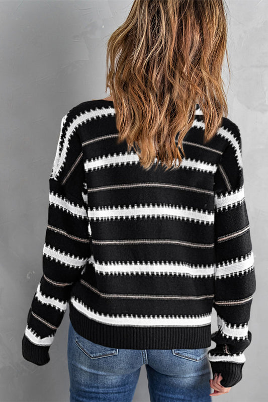 Black V Neck Stripes Colorblock Button Cardigan