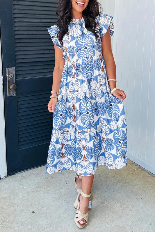 Sky Blue Tropical Botanic Print Flutter Sleeve Vacation Long Dress
