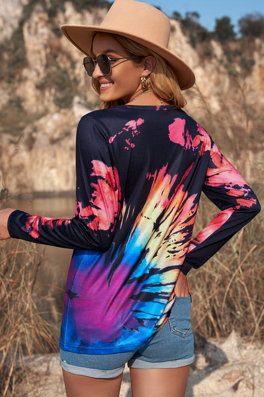 Rainbow Color Tie Dye Cut-out Long Sleeve Blouse
