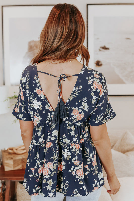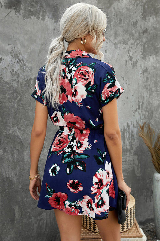 Blue Floral Shirt Collar Short Sleeve Mini Dress