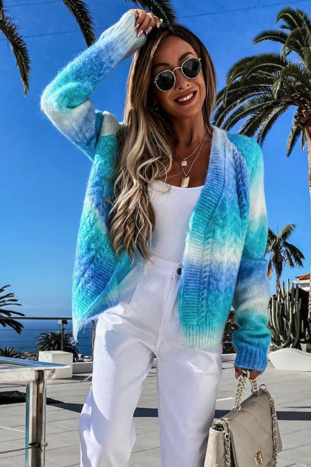 Blue Gradient Open Front Colorblock Tie-dye Cardigan