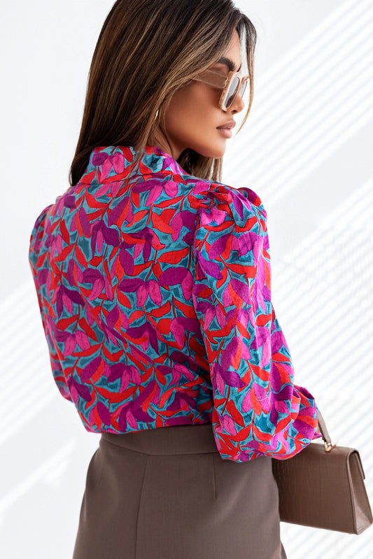 Multicolor Abstract Floral Button Up Long Puff Sleeve Shirt
