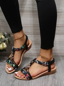 Black Flower Decor Braided Design Ankle Strap Sandals