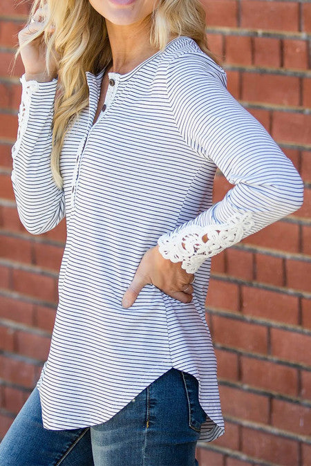 Round Neck Lace-cut Stripe Long Sleeve Top