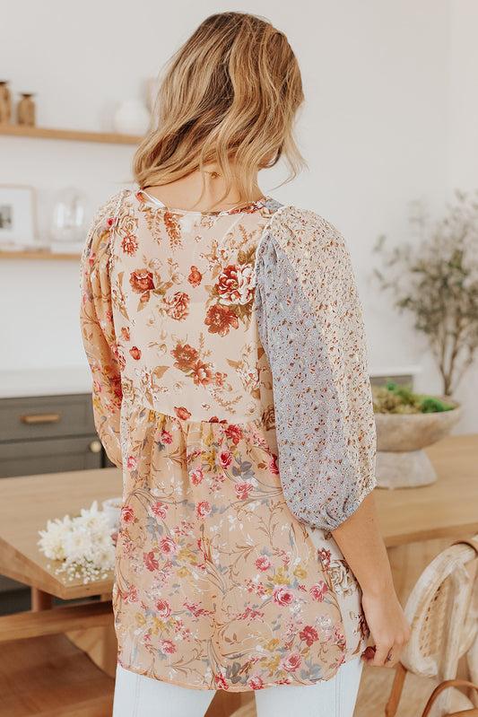 Multicolor Paisley Print Bell Sleeve Lace V-Neck Button Sheer Blouse