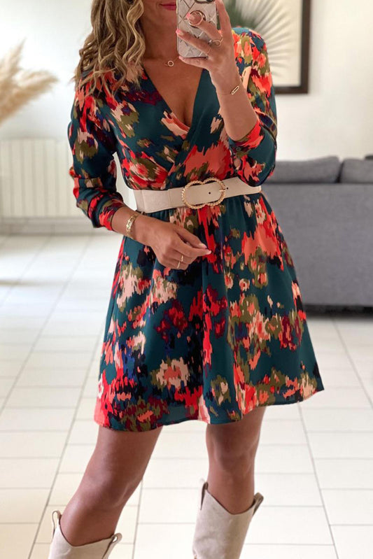 Green Abstract Print V Neck Puff Sleeve A-line Dress