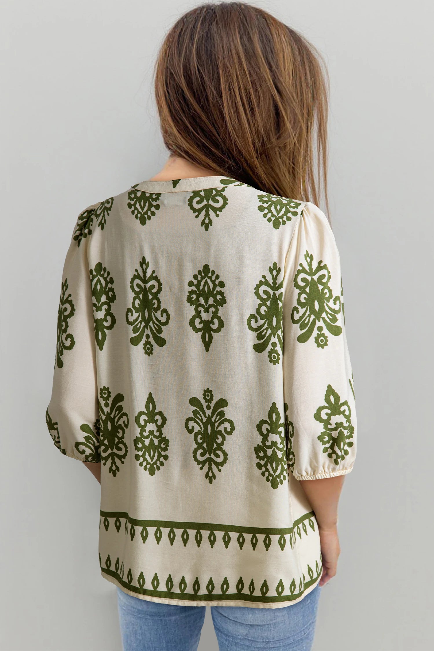 Apricot Floral Print Tie V Neck Button Down Puffy Half Sleeve Shirt