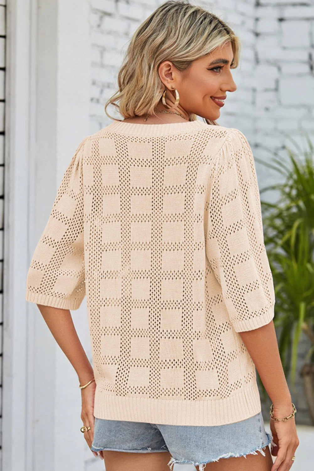 Apricot Plaid Pattern Crochet Knit Short Sleeve Sweater