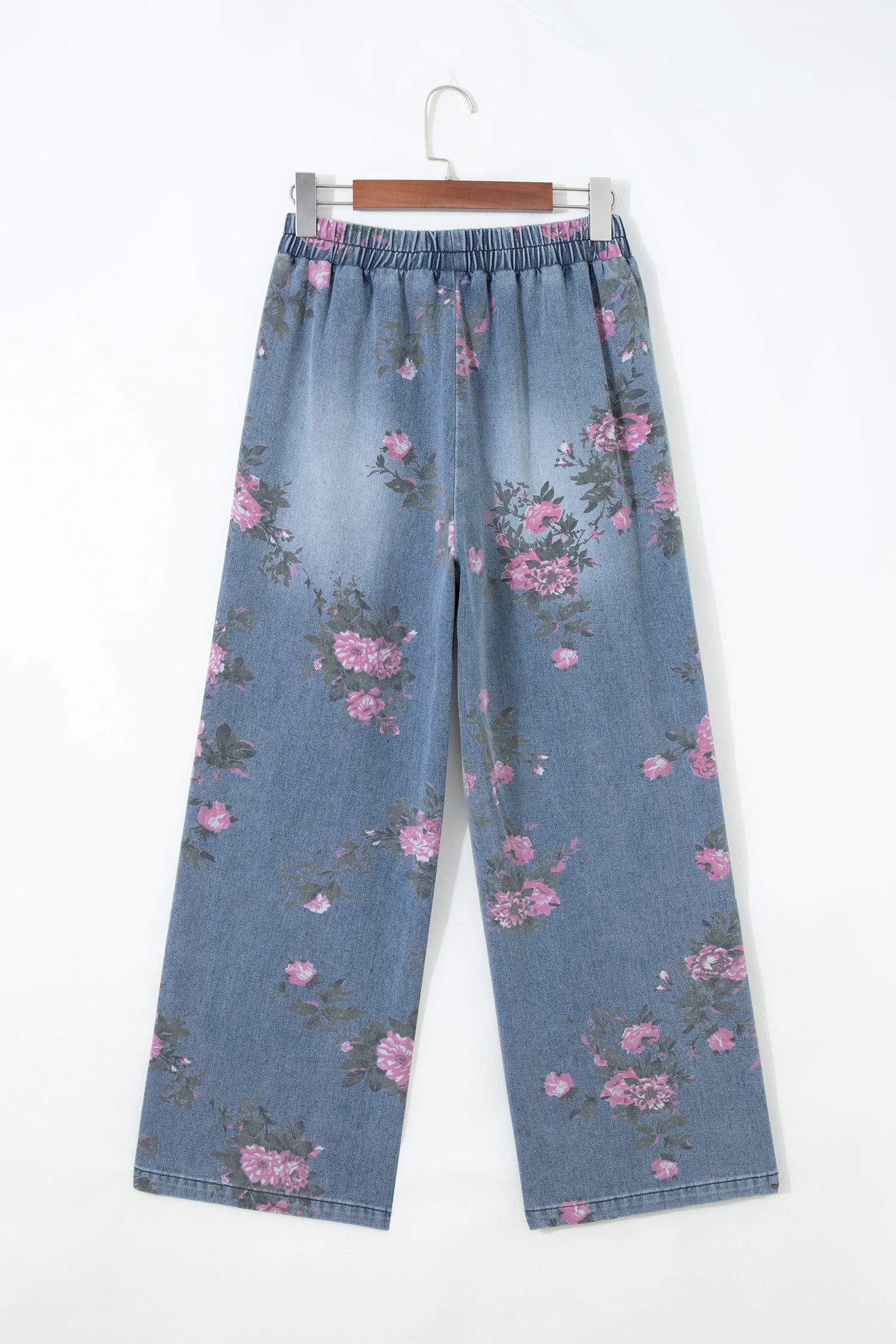 Beau Blue Floral Print Elastic Waist Pull On Casual Jeans