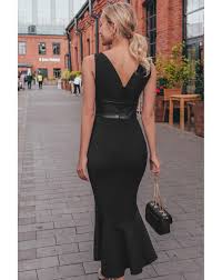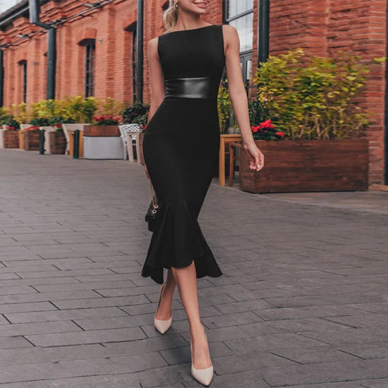 Black Leather Girdle Patch Sleeveless Fishtail Dress