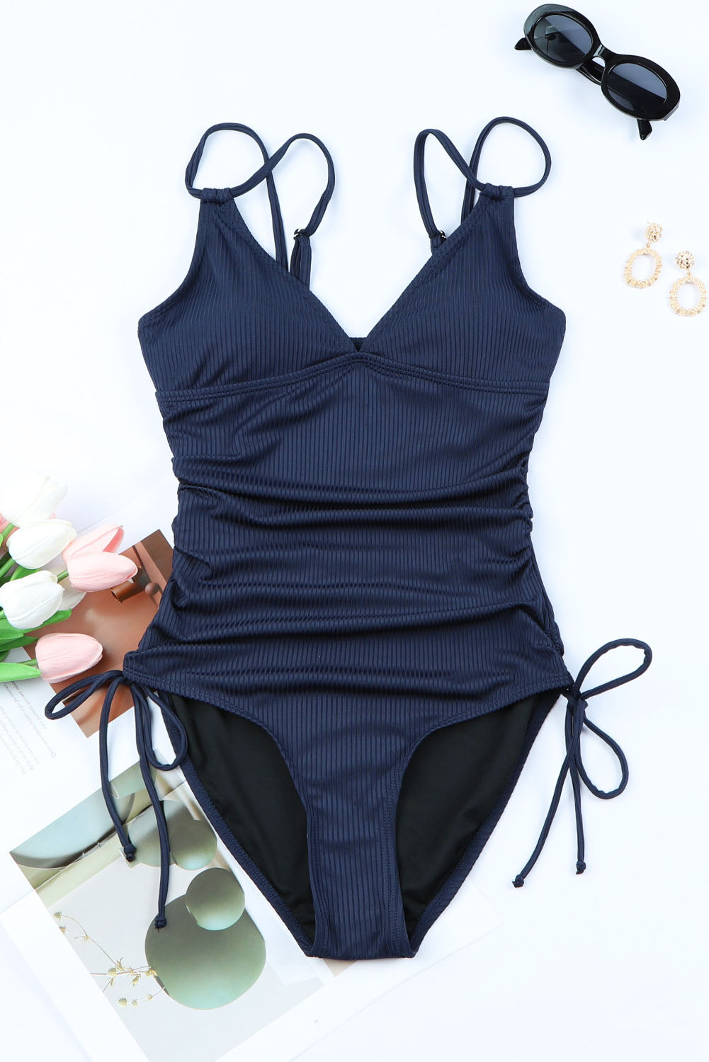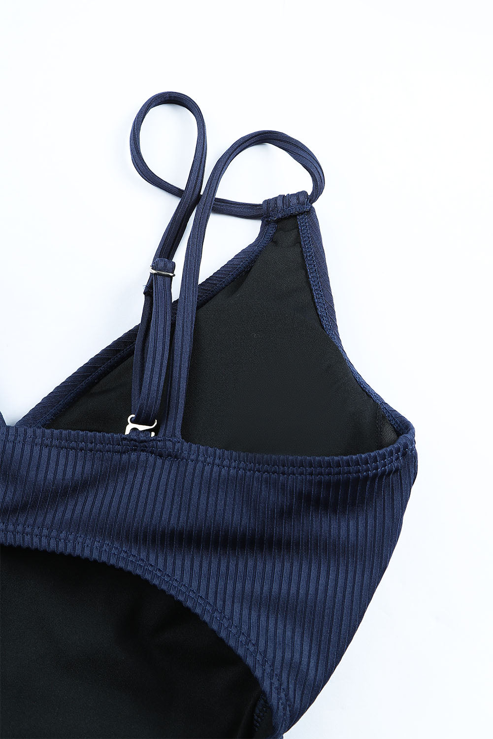 Blue Adjustable Straps Ribbed Knit One Piece Swimsuit