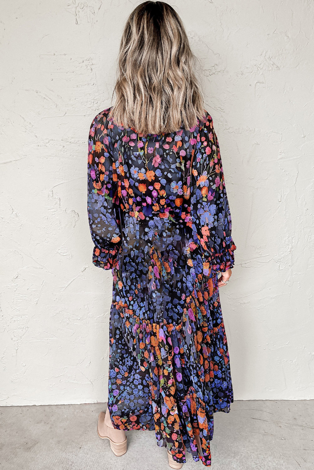 Blue Floral Print Tassel Tie V Neck Long Sleeve Flowy Long Dress