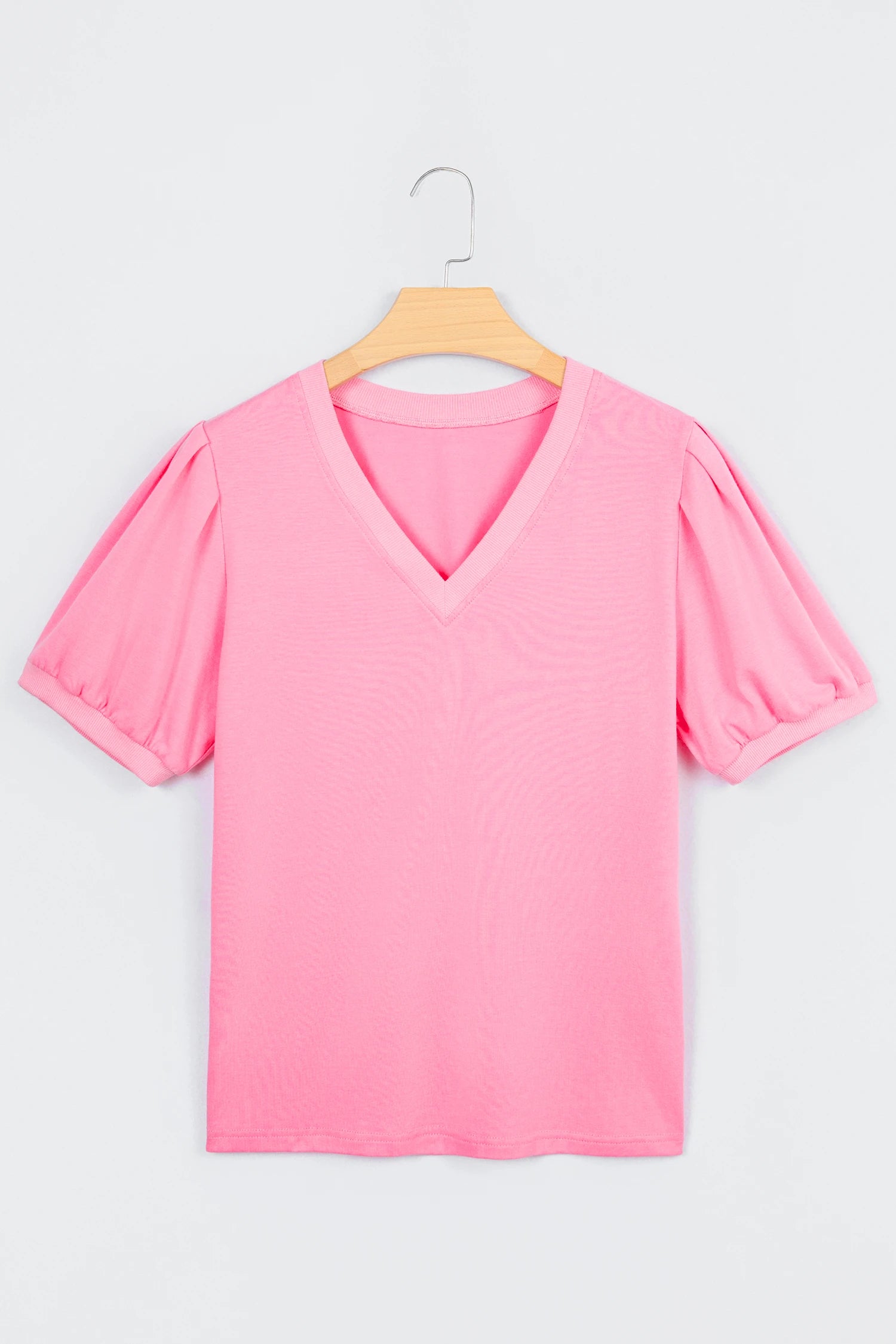 Bonbon Solid Color V Neck Short Puff Sleeve Blouse
