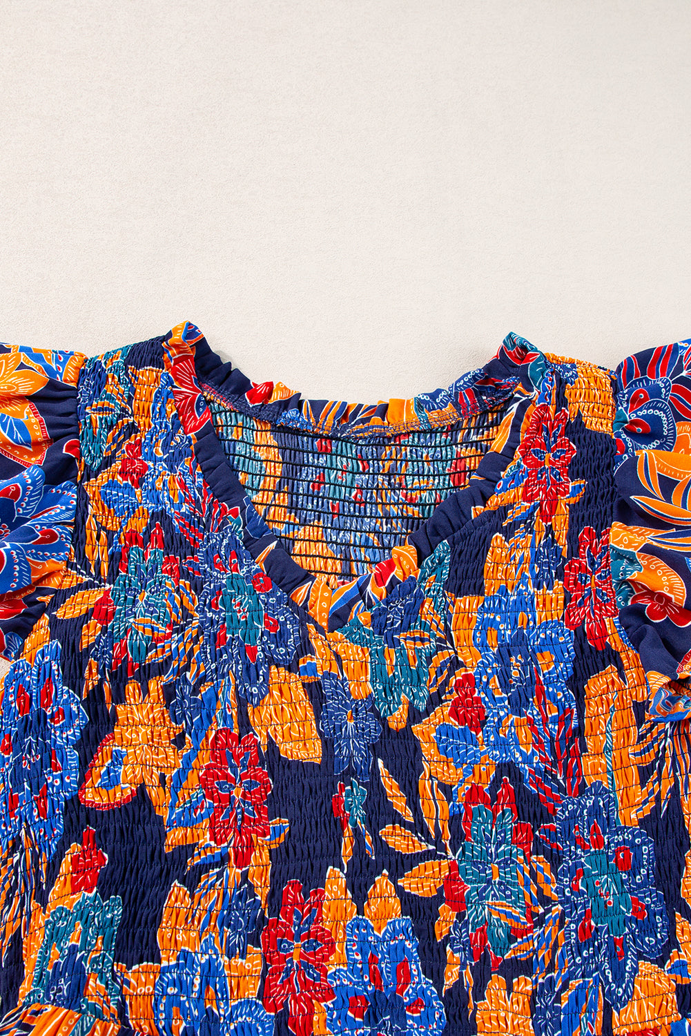 Dark Blue Boho Floral V Neck Ruffle Tiered Long Dress