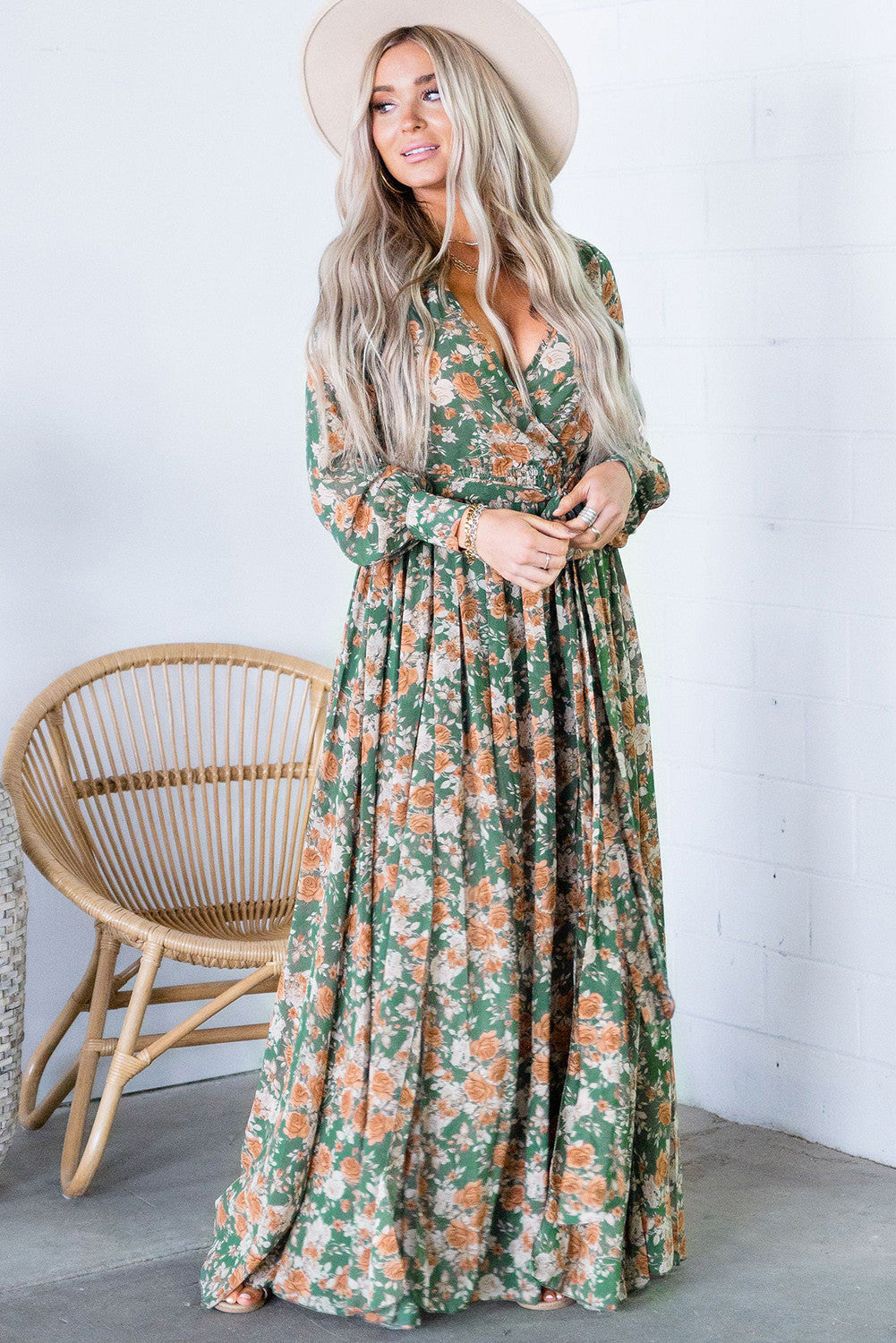 Green Wrap V Neck Maxi Floral Dress with Side Slit