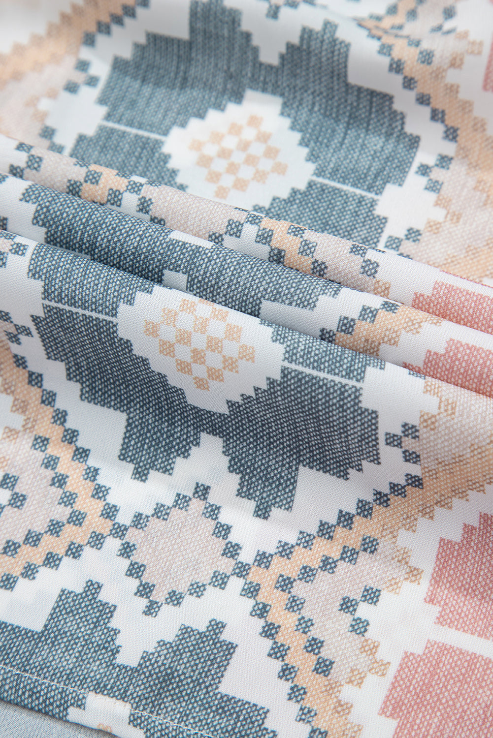 Khaki Geometric Print Tassel Tie Split Neck Balloon Sleeve Blouse