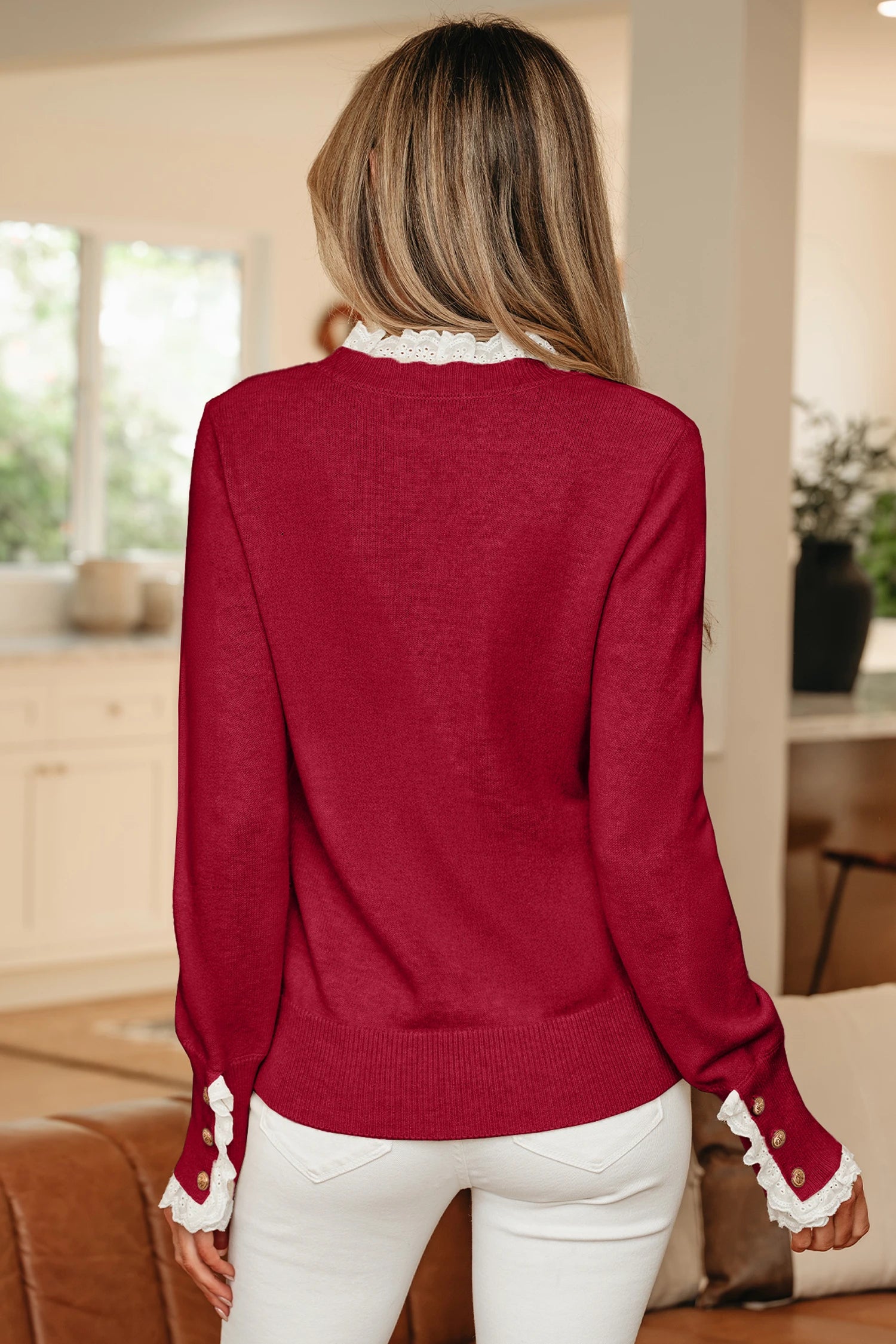 Lace Trim Patchwork Buttoned Cuffs Loose Sweater