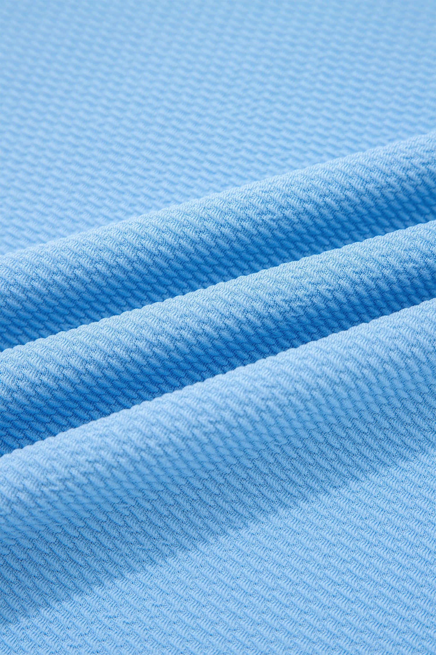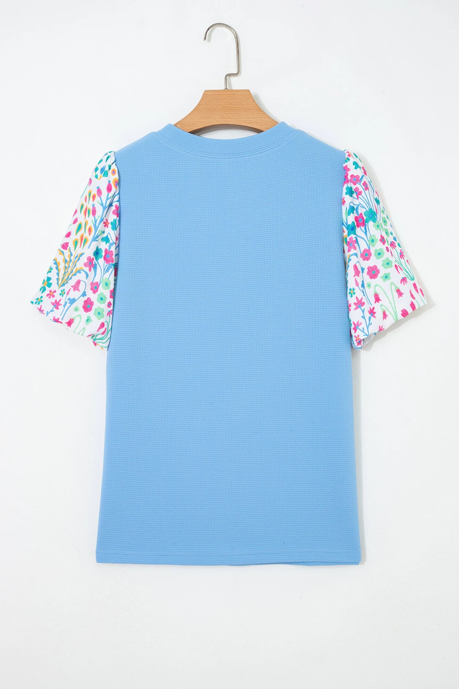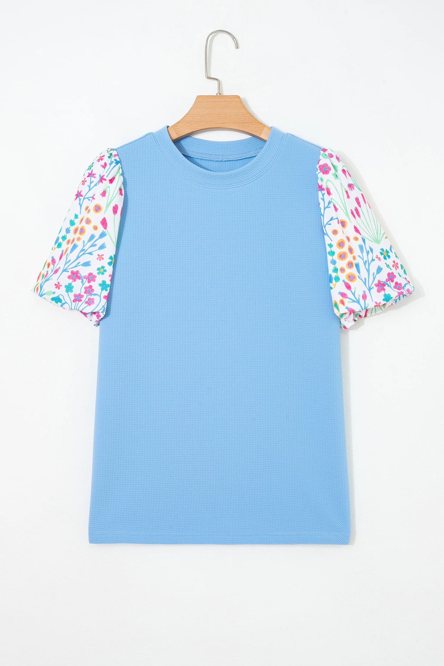 Light Blue Round Neck Textured Contrast Floral Bubble Sleeve Blouse