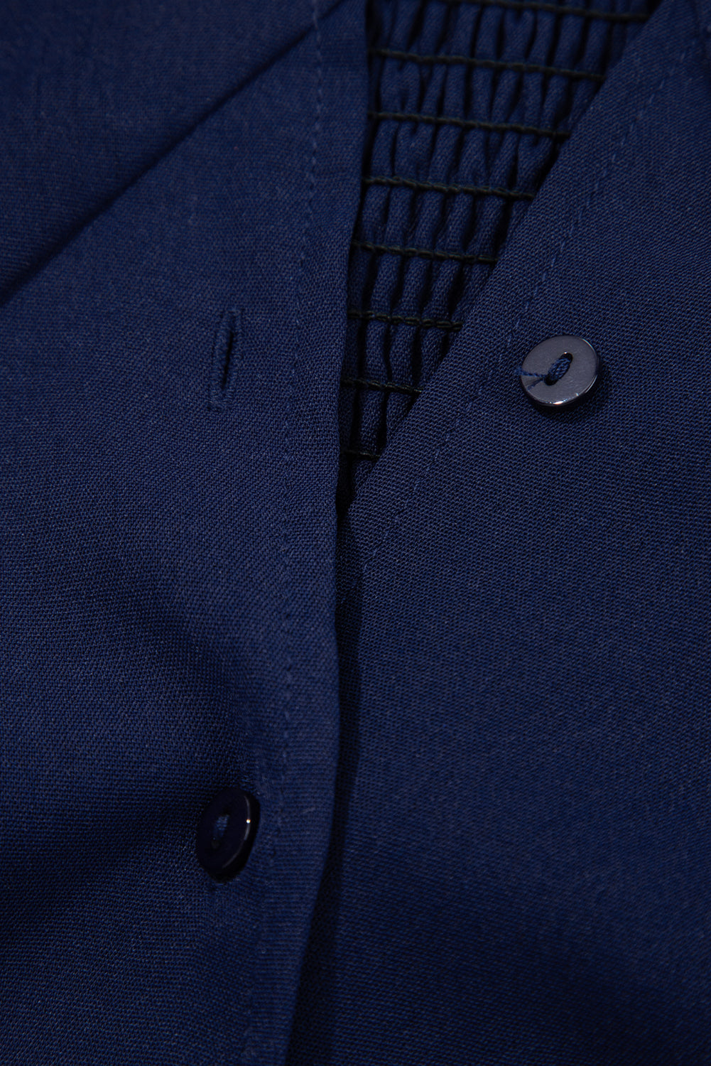 Navy Blue V Neck Buttoned Front Shirred Back Short Sleeve Midi Dress