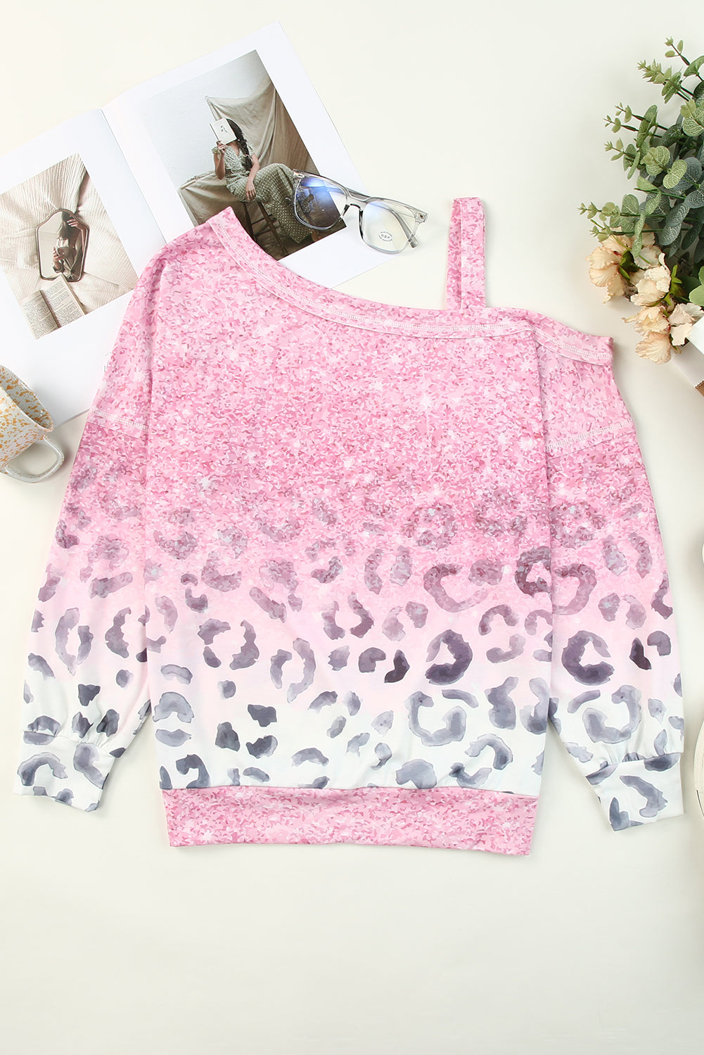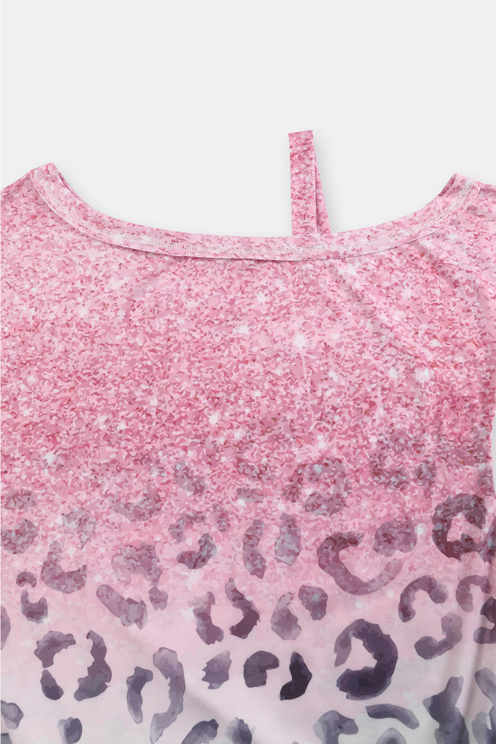 Pink Leopard Patchwork One Shoulder Long Sleeve Top