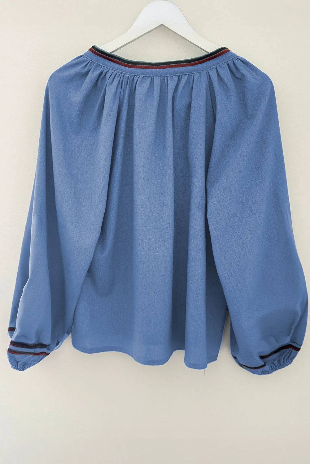 Real Teal Floral Embroidered Split Neck Tassel Tie Puff Sleeve Blouse