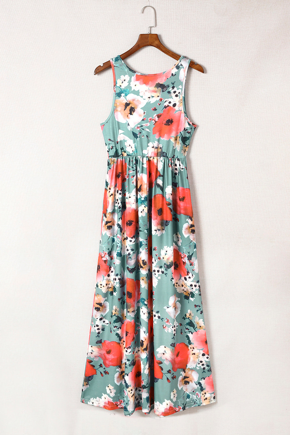 Sky Blue Boho Print Sleeveless High Waist Long Floral Dress