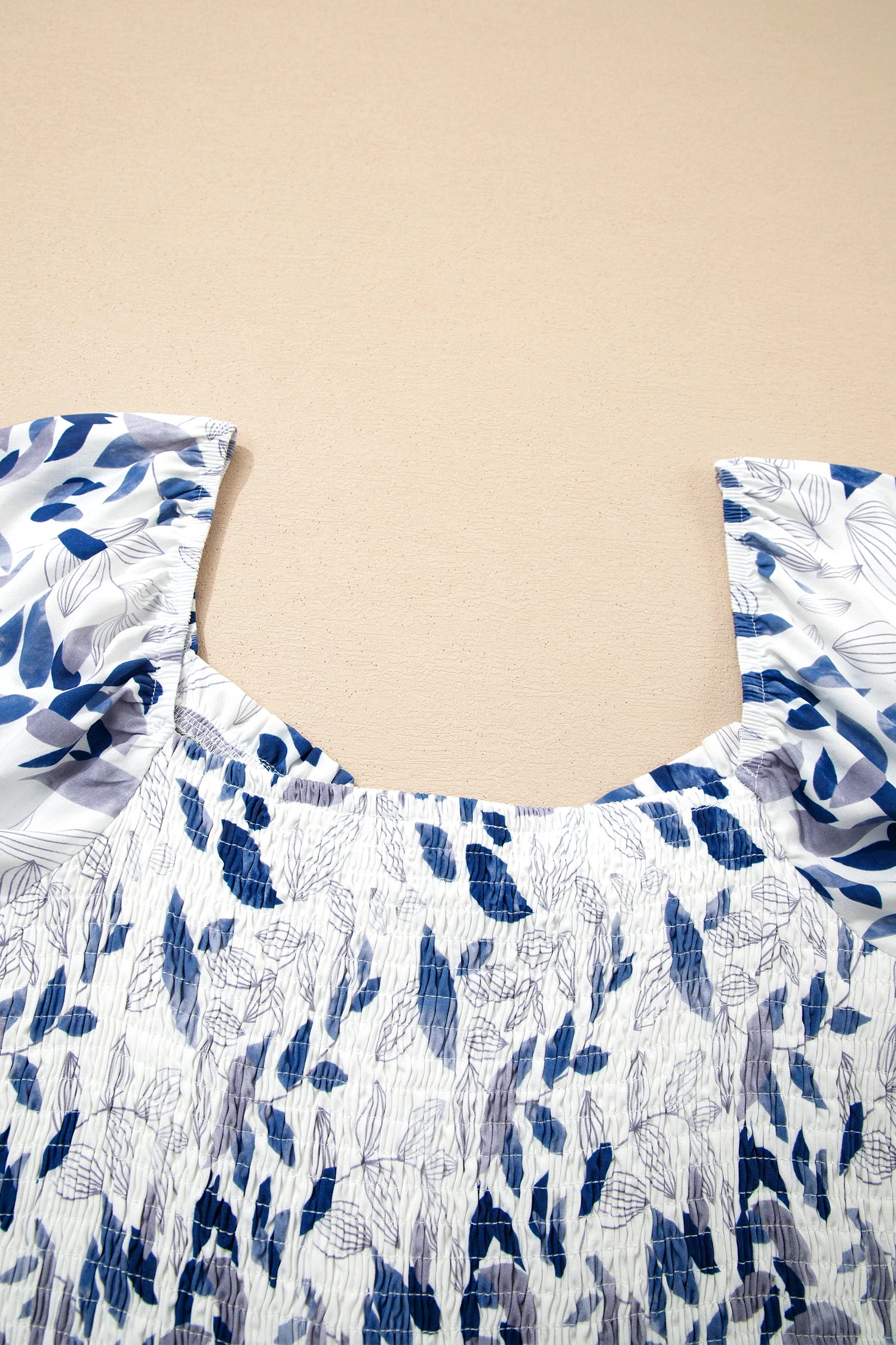 Sky Blue Smocked Bodice Short Puff Sleeve Tiered Floral Midi Dress