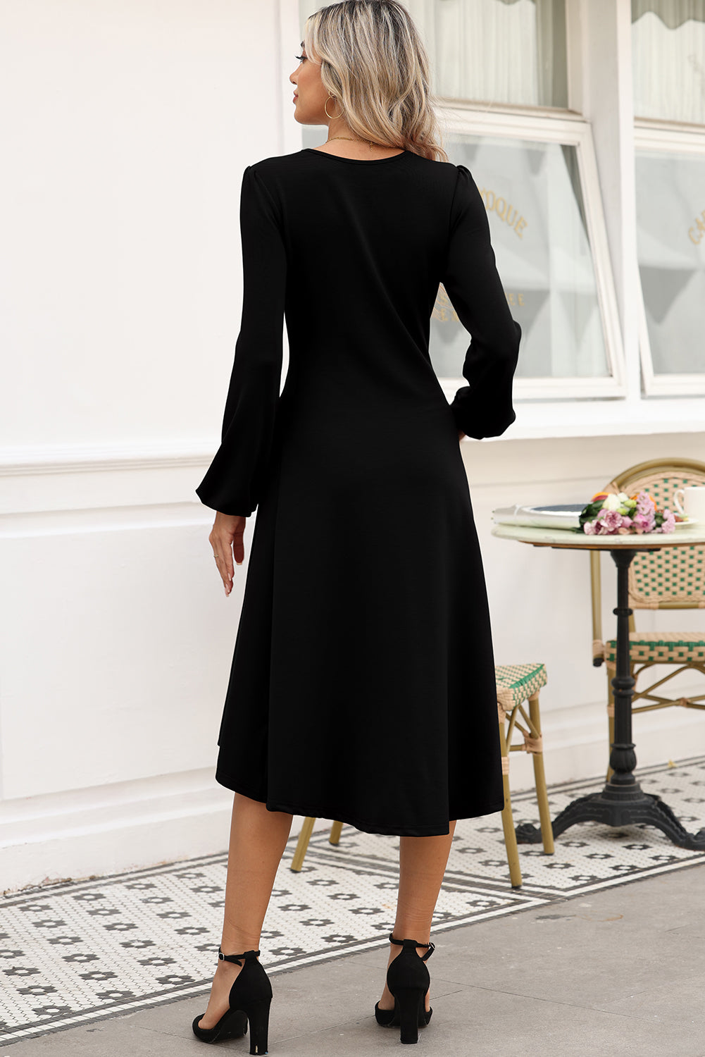 The midi length and puff sleeves.
